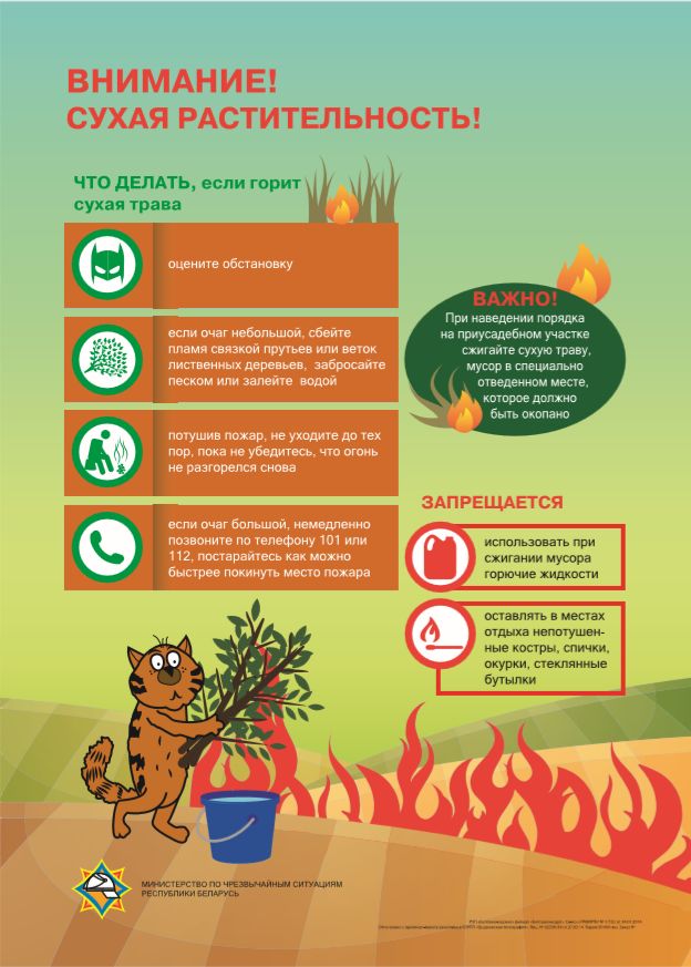 — ни в коем случае не жгите траву. Не оставляйте горящий огонь без присмотра. Тщательно тушите окурки и спички перед тем, как выбросить их;