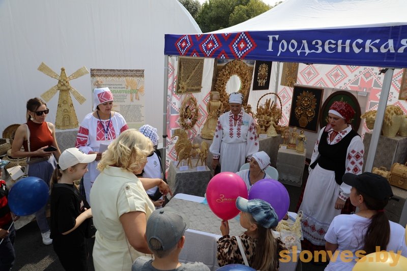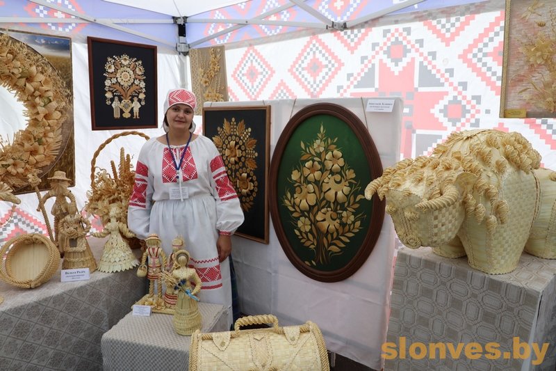 Анастасия Зеленко знакомит посетителей павильона Слонимского отдела ремесел и традиционной культуры с изделиями, выполненными из соломы.