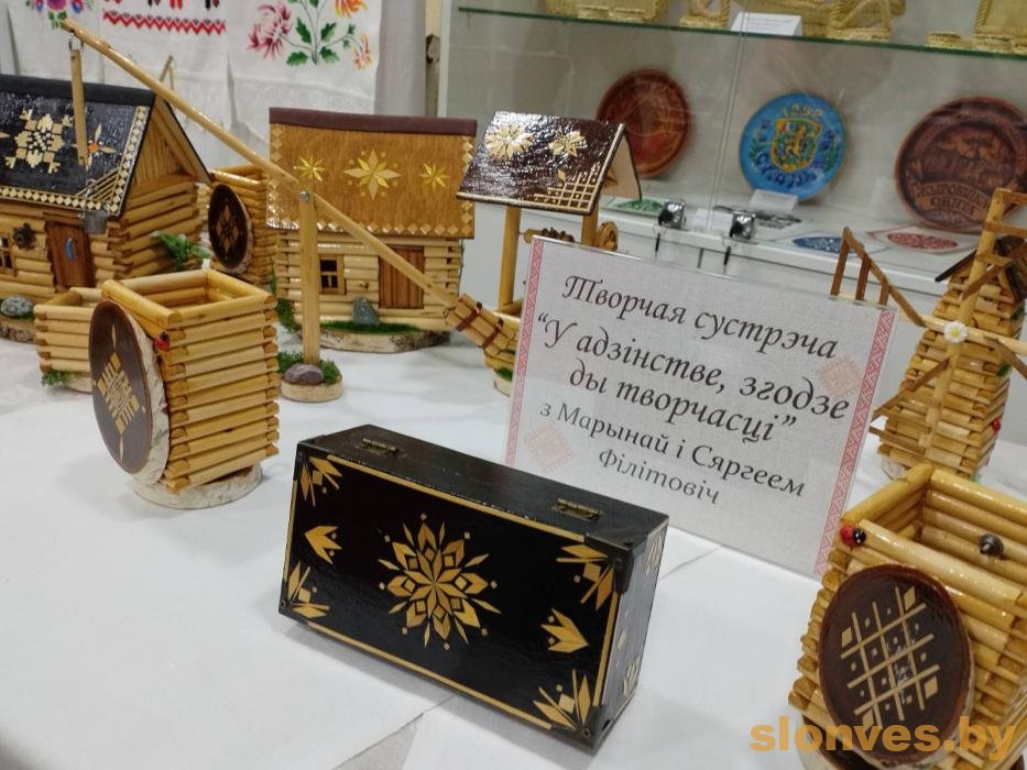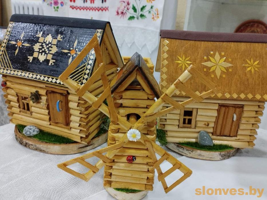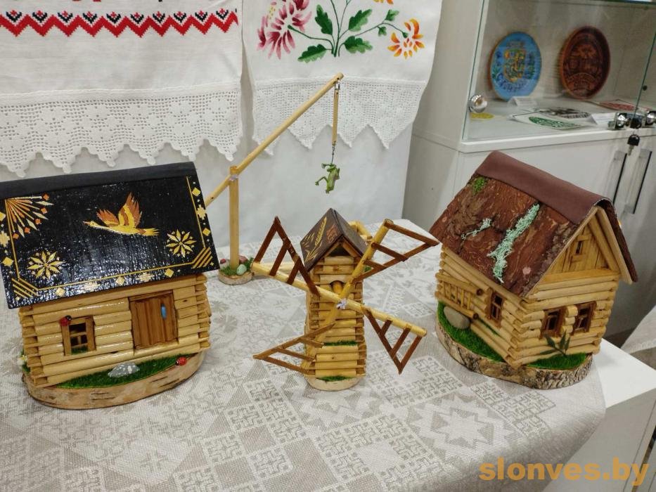 Удзельнікі мерапрыемства змаглі пазнаёміцца з калекцыяй аўтарскіх вырабаў творчага сямейнага тандэма: дэкаратыўнымі вясковымі хаткамі, калодзежамі, млынамі, дэкарыраванымі алоўніцамі.