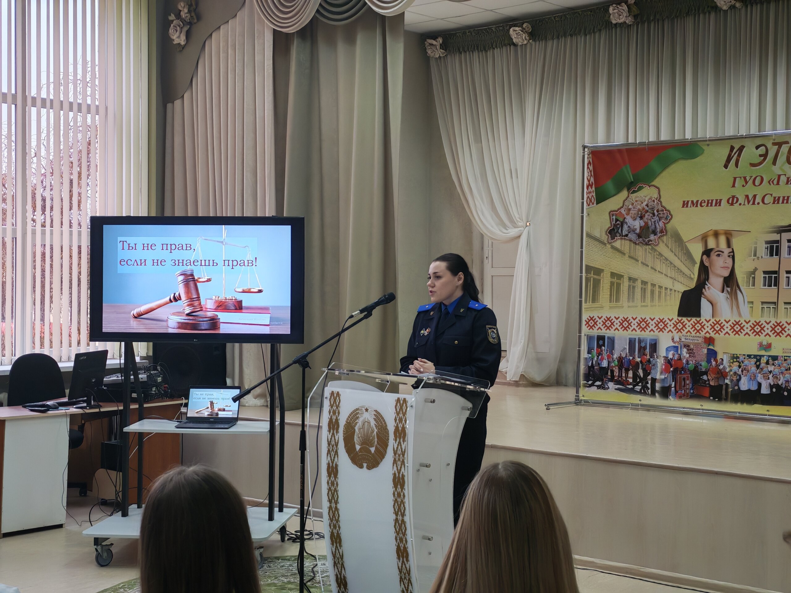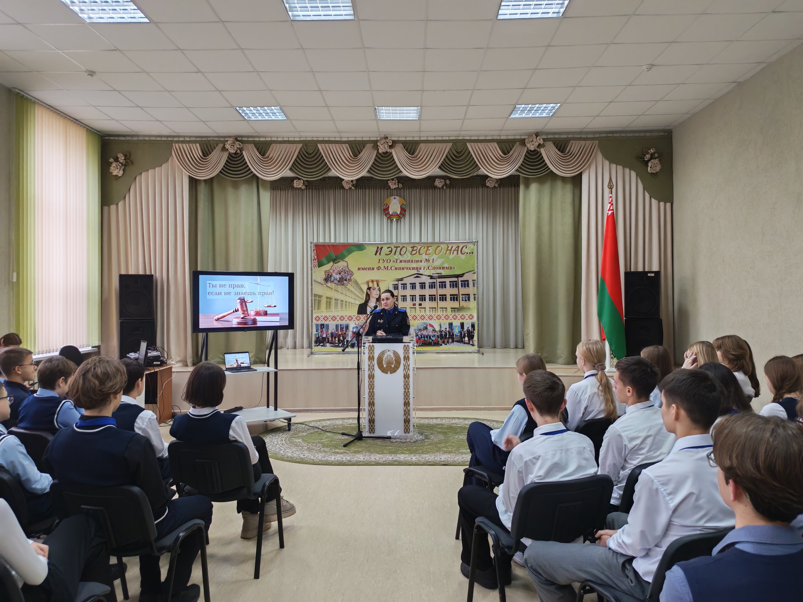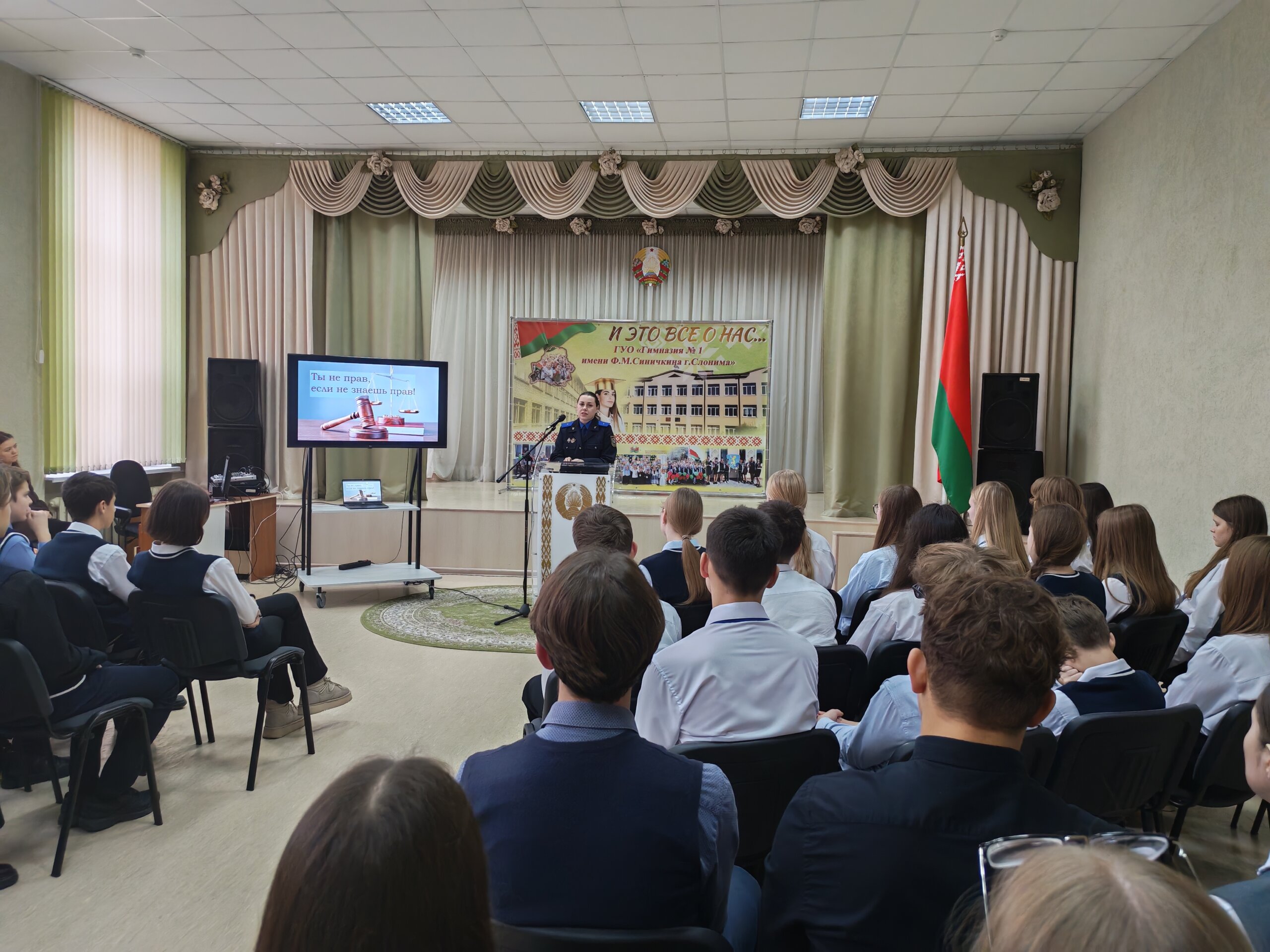 Старший следователь Слонимского райотдела следственного комитета Юлия Олеговна Петрова провела диалоговую площадку «Ты не прав, если не знаешь прав» для учащихся 8-11 классов . Она отметила, что благодаря правам человека в нашем обществе царят справедливость, равенство и взаимопонимание, а мы можем развиваться как личность, выбирать профессию, прогнозировать будущее, добиваться успехов.