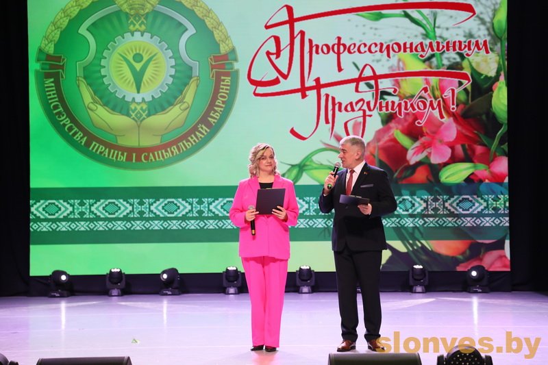 С хорошими пожеланиями и словами благодарности за преданность своему делу к собравшимся в зале обратились – председатель Слонимского районного исполнительного комитета Геннадий Болеславович Хомич, председатель Слонимского районного Совета депутатов, председатель Слонимского районного отделения Белорусской партии «Белая Русь» Олег Мечиславович Таргонский, начальник управления по труду, занятости и социальной защите Слонимского районного исполнительного комитета Инна Денисовна Назаренко.