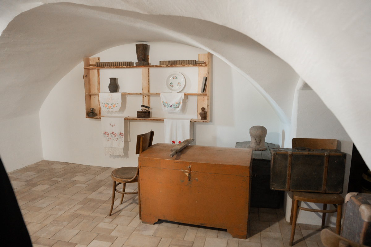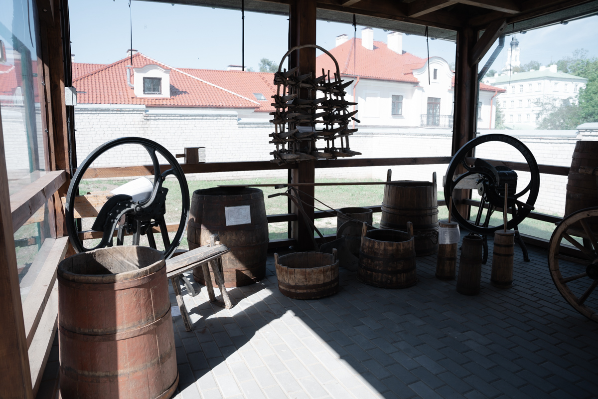 С восточной стороны дома устроен навес, где представлена экспозиция предметов быта, орудий сельского хозяйства и ремесел прошлых веков.