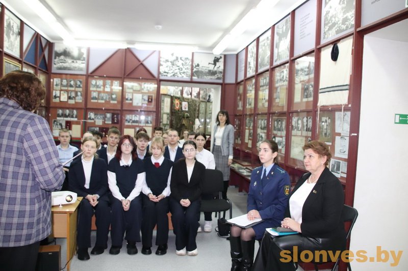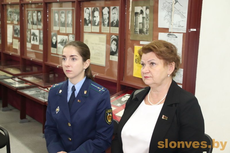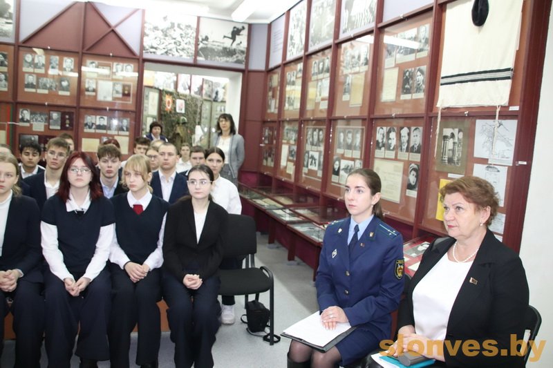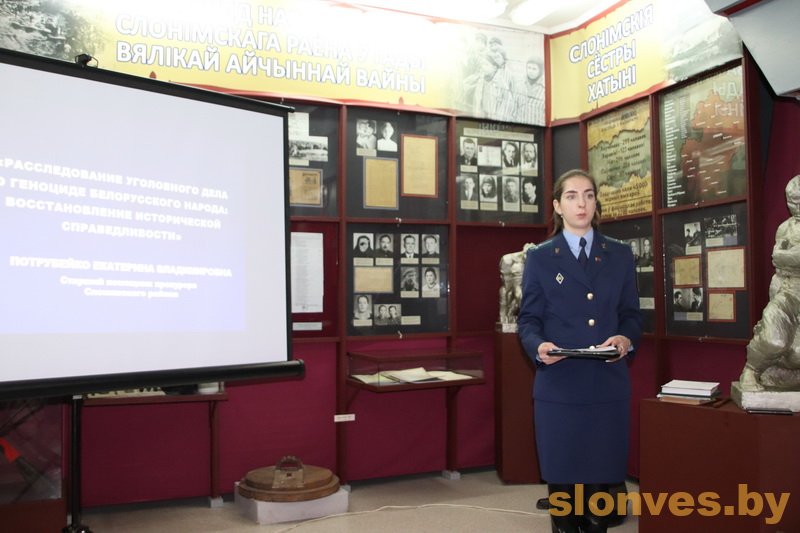 Старший помощник прокурора Слонимского района Екатерина Владимировна Потрубейко напомнила, что в январе 2022 года по инициативе Генеральной прокуратуры был принят Закон «О геноциде белорусского народа», чтобы сохранить память о миллионах советских граждан, которые стали жертвами войны, дать справедливую оценку злодеяниям нацистских преступников и их пособников, установить действенные барьеры на пути попыток фальсификации событий и итогов войны. В выступлении Екатерины Владимировны содержалась информация о том, как велось расследование и какие результаты получены. Благодаря продемонстрированным на уроке памяти видеоматериалам участники составили представление о масштабах трагедии, которая постигла наш народ.