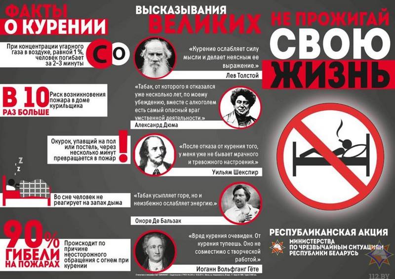 За цифрами статистики стоят факты и примеры из жизни: каждый год в сводках спасателей все чаще попадают любители «подымить». Так, в августе текущего года произошло возгорание жилого дома по улице Леошени города Слонима. В момент пожара в доме находился мужчина, которого спасатели нашли, лежащим на полу в комнате. Причиной возгорания стало курение в постели.